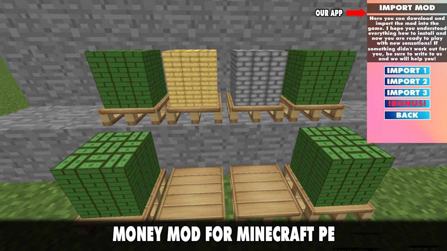 😀🤣If you are tired of the regular version of Minecraft and want to diversify the gameplay, you can install one of our modifications. This is what we talked about above. But this will not be an ordinary addition that adds fabulous animals, new locations or props, but a unique mods. You can download the always updated Money Mod for Minecraft Pocket Edition 2022!🤣😀