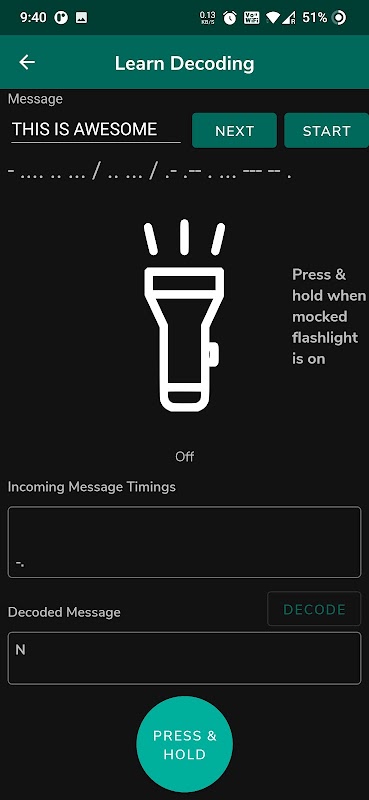 - اس ایپ کے ذریعہ ، آپ نہ صرف مورس کوڈ میں پیغامات بھیج سکتے ہیں بلکہ آنے والے پیغام کو ڈی کوڈ بھی کرسکتے ہیں۔