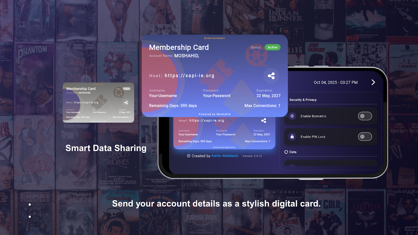 🪪 اسمارٹ ڈیٹا شیئرنگ - ڈیجیٹل ممبرشپ کارڈ کے ذریعے آسانی سے اپنے IPTV اسناد کا اشتراک کریں۔