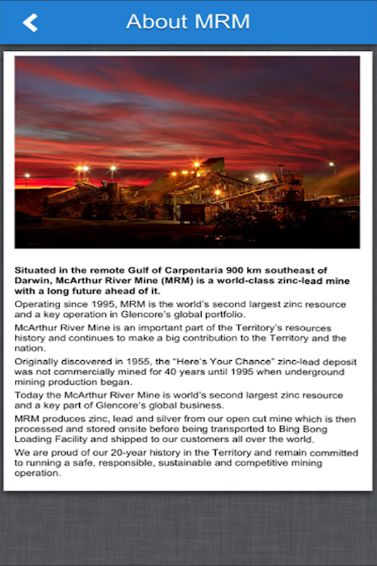 This App provides information and support for the Village Community of the McArthur River Mine.