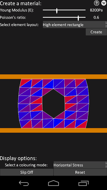 Squeeze the orange bars to compression test the material shown on screen. The deformation and stress distribution is calculated on the fly and visualised. Material parameters and geometry of the test part can be chosen. Visualisation shows one of either normal or shear stresses or the von Mises yield criterion.