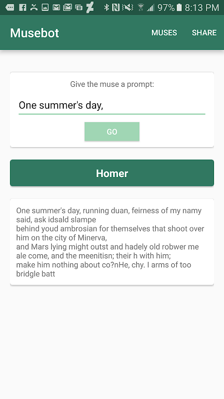 Musebot is an author in your pocket. Shakespeare, Homer, Dickinson, and more—generate text in the unique style of each of these writers, for your literary entertainment.