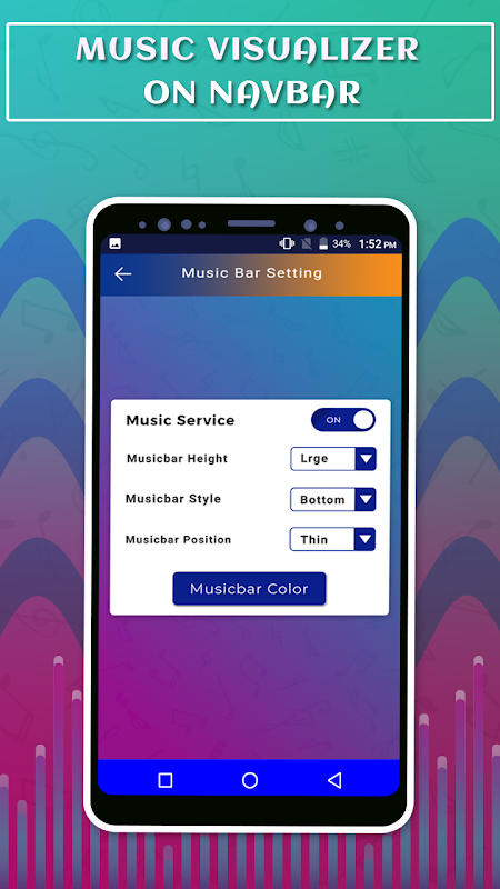 Music Visualizer on Navbar application with make a more easy touch and use one particular color for a navigation bar. Change everyday color of music navigation bar and make an easier touch of your mobile screen. Application is simple and easy to use just install app and start to set your choice navigation bar for free.