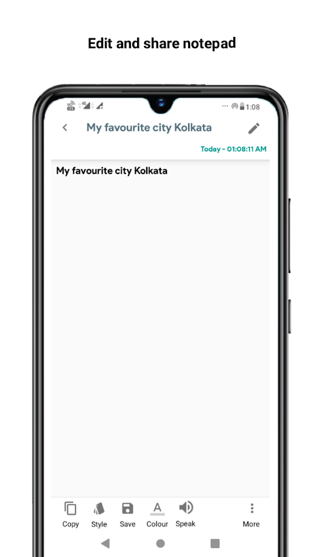 My Notepad There are allmany options for write notepad. Write Notepad to speech. Share text, zoom in and zoom out text, add favorite notepad, edit notepad.