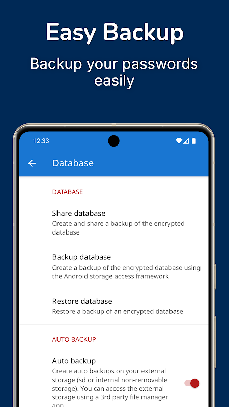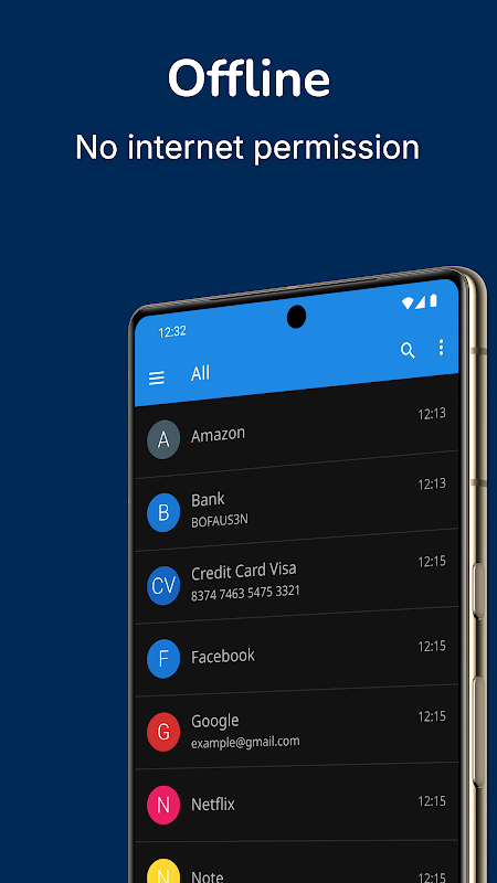 کلاؤڈ بیسڈ مینیجرز کے برعکس، آپ کا ڈیٹا کبھی بھی آپ کے آلے سے نہیں نکلتا، اس بات کو یقینی بناتا ہے کہ 100% سیکیورٹی بغیر انٹرنیٹ رسائی کے۔