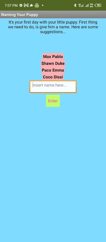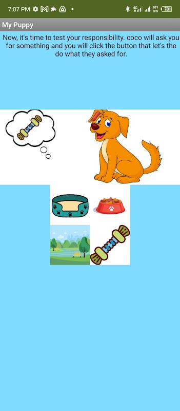 In this application, you will have a little puppy that you will need to care for. Your pup is a golden retriever, that you will be able to name, play with, feed and take for some relaxing walks in the park! When your pup wants something, you will need to click on the corresponding button. If you make him do or give him something that he does not want, he will keep asking for the same thing! When you name your pup, the app will give you suggestions for some names, but you are not forced to use one of them because as i said, they are just suggestions!