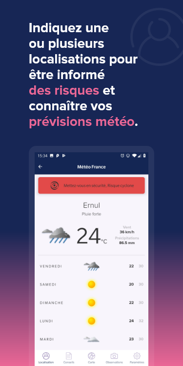 ہائیڈرو میٹرولوجیکل خطرات کی صورت میں ، خبردار کیا جائے اور اپنے پیاروں کو دلچسپی کے متعدد مقامات کا انتخاب کرکے مطلع کریں جس کے ل push پش اطلاعات موصول ہوں۔ اس خصوصیت (5 ممکنہ پتے اور "براہ راست جیو لوکیشن" فنکشن) کے ذریعہ ، آپ کو کسی بھی وقت پتہ چل جائے گا کہ آیا آپ کے چاہنے والوں کو احتیاطی تدابیر اختیار کرنے کی ضرورت کا خطرہ لاحق ہے۔ ایپ آپ کو دنیا میں جہاں بھی ہو ، چلتے پھرتے بھی آگاہ کرتا رہتا ہے۔