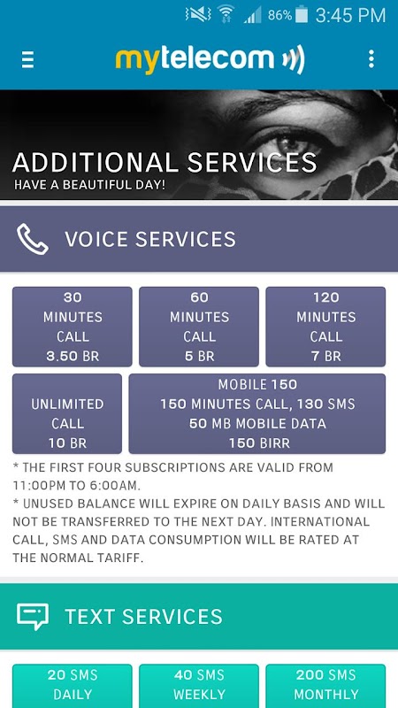 myTelecom lets you check your prepaid mobile balance without the need to contact ethio telecom, giving you a real time balance check. The application also gives you a break down of your usage by voice, SMS and data. In addition to that myTelecom, will let you check your balance in the traditional manner, send a call me back request, transfer balance, and many more with a single tap. The application also enables you to use Ethio Telecom’s various prepaid services including voice, SMS and data with a single tap from its home screen. It’s a simple, fast and fun way to use Ethio Telecom’s prepaid mobile services.
