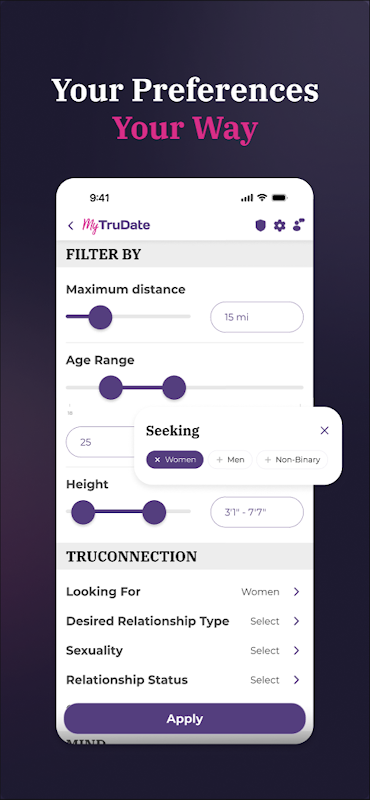 MyTruDate ٹائم چوسنے والے الگورتھم کو عالمی معیار کے درست فلٹرز سے بھی بدل دیتا ہے جو صارفین کو ان کی ترجیحات کی بنیاد پر فوری طور پر دوسرے سنگلز کو تلاش کرنے اور تلاش کرنے کا اختیار دیتا ہے - ہفتوں کے سوائپنگ کے بعد نہیں۔ مزید کوئی الگورتھم آپ پر ایسے پروفائلز کے ساتھ بمباری نہیں کرتے جو آپ کی قسم کے نہیں ہیں، جو آپ سے بہتر اختیارات تک رسائی کے لیے اضافی رقم وصول کرتے ہیں، اور جن پر آپ کا کوئی کنٹرول نہیں ہے۔