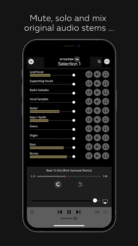 ٹیمپو کنٹرول، لوپنگ اور شیٹ میوزک کے ساتھ ہر اسٹیم کے لیے گونگا، سولو، پین اور فیڈ کی خاصیت۔ ہر آلے (تنہ) کی سطح کو ایڈجسٹ کرکے، سامعین بجانے یا گانے کے لیے بہترین مرکب بنا سکتے ہیں۔