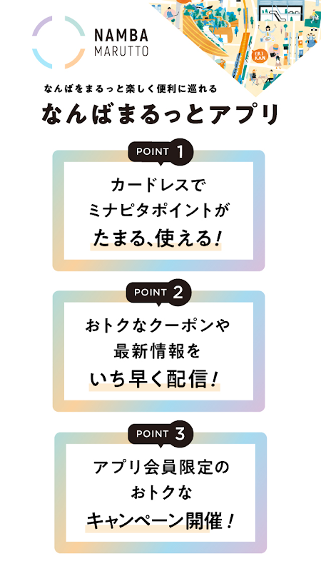 "Namba Marutto" ایپ آپ کو بغیر کارڈ کے بھی Minapita پوائنٹس جمع کرنے اور استعمال کرنے کی اجازت دیتی ہے۔ آپ ایپ پر "ڈیجیٹل ممبرشپ کارڈ" جاری کر سکتے ہیں اور آسانی سے اور بڑی قیمت پر خریداری کر سکتے ہیں۔