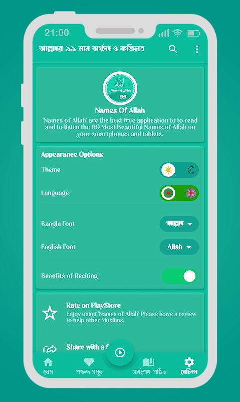 99 اللہ کے نام - بنگلہ اور انگریزی অ্যাপটি 5* রেটিং এবং আত্মীয়-সজন, বন্ধু-বান্ধবের সাথে শেয়ার করে আপনিও ইসলাম প্রচারে অংশ নিন।