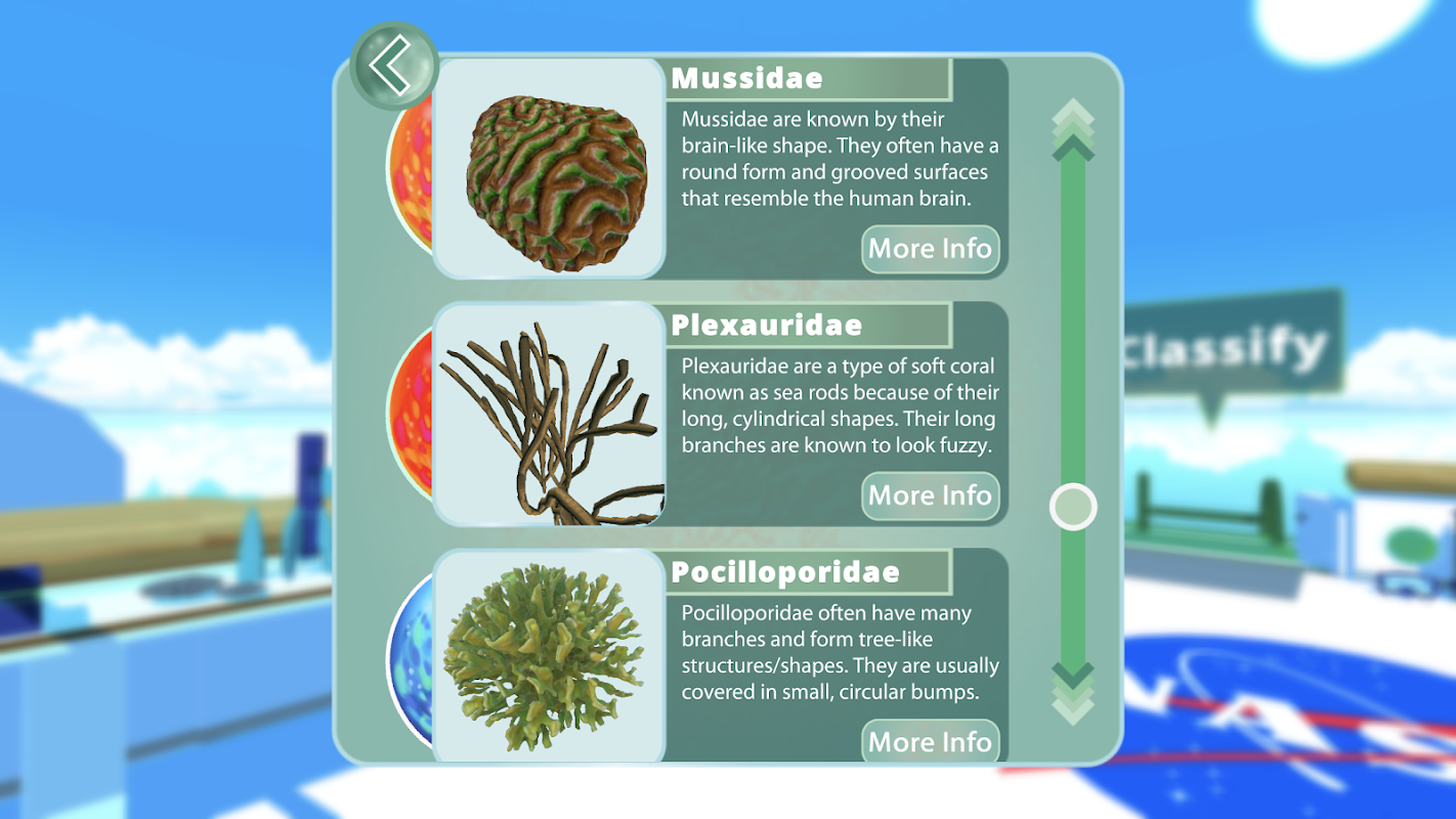 مرجان کی چٹانوں کی درجہ بندی کرنے میں ہماری مدد کرکے ناسا کی ٹیم میں شامل ہوں! دنیا کا سفر کریں ، سمندر کی جنگلی زندگی سے دوستی کریں ، اور 3D میں پینٹ کرکے اصلی مرجان کی درجہ بندی کریں۔ آپ نے جو درجہ بندیاں تخلیق کیں وہ براہ راست ناسا جاتی ہیں اور سمندروں کی حفاظت میں مدد کرتی ہیں!
