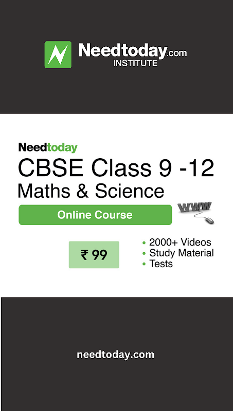 Needtoday انسٹی ٹیوٹ فی الحال CBSE کلاس 9 - 12 کے لئے ریاضی اور سائنس میں آن لائن کورسز پیش کر رہا ہے جس میں ہر کورس ہر کلاس کے 250+ آن لائن ویڈیوز، مطالعہ کا مواد اور ٹیسٹ پر مشتمل ہے۔