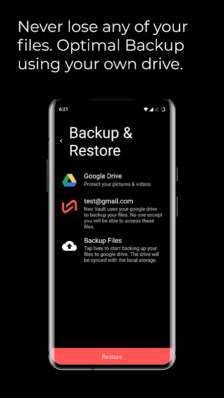 Neo Vault آپ کی تمام نجی تصاویر اور ویڈیوز کو چھپانے کے لیے ایک نجی اور محفوظ فوٹو والٹ ہے۔ فوٹو والٹ میں چھپی تمام فائلوں کو اس پن کے ذریعے انکرپٹ کیا جاتا ہے جسے آپ والٹ گیلری کو لاک کرنے کے لیے استعمال کرتے ہیں۔ آپ PIN یا اپنے فنگر پرنٹ کے ذریعے فوٹو والٹ کو غیر مقفل کر سکتے ہیں۔ آپ کی نجی پوشیدہ تصاویر آپ کے آلے کو کبھی نہیں چھوڑتی ہیں اور آپ کے علاوہ کوئی بھی ان تک رسائی حاصل نہیں کر سکتا۔ اگر آپ ایسا کرنا چاہتے ہیں تو آپ اپنی فائلوں کا محفوظ طریقے سے اپنی گوگل ڈرائیو میں بیک اپ لے سکتے ہیں۔