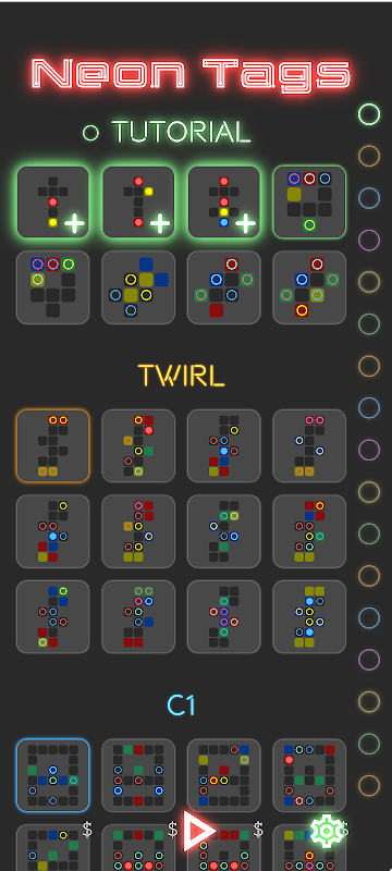 نیون ٹیگز کی 165 سے زیادہ منفرد سطحیں ہیں۔ 24 سطحیں مفت میں دستیاب ہیں، باقی کسی بھی وقت خریدی جا سکتی ہیں۔ تمام سطحوں کو حصوں میں تقسیم کیا گیا ہے، لہذا آپ ہر ایک سیکشن کو شروع کر سکتے ہیں جو آپ چاہتے ہیں اور ایک ایک کرکے سیکشن کی سطحوں سے گزر سکتے ہیں، آسان سے بہت مشکل تک۔
