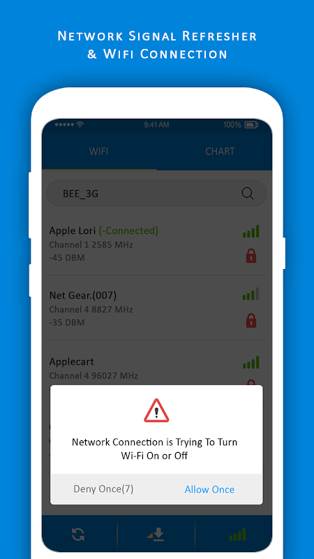 Network Signal Refresher & Wifi Connection wil show you all near your wifi connection and also show chart.You have also choice to search wifi button and search your network easily and refresh it.