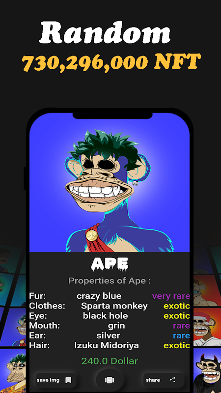 ہم خصوصیات (کھال، کپڑے، آنکھیں، منہ، کان، بال) کے ساتھ تیزی سے انفینٹی رینڈم این ایف ٹی بندر بناتے ہیں۔