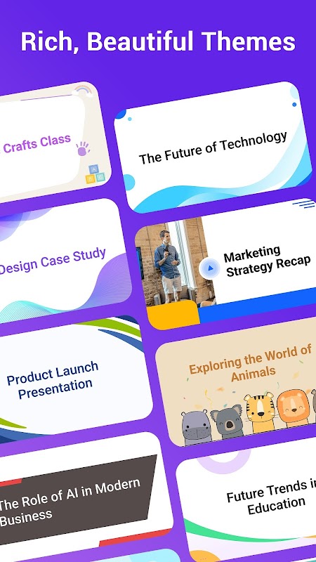 🔹 پروفیشنل لے آؤٹس اور تھیمز: ورسٹائل لے آؤٹس اور بھرپور تھیمز کی وسیع اقسام میں سے انتخاب کریں۔ فوری طور پر پیشہ ورانہ طرزیں لاگو کریں تاکہ آپ کی سلائیڈز ایسے نظر آئیں جیسے انہیں کسی پیشہ ور نے ڈیزائن کیا ہو۔