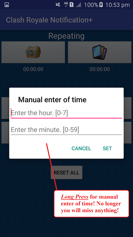 2) You can also LONG-PRESS the buttons for manual insert of timing. This is great for people who have like 5h33min left to next request or chest unlock.