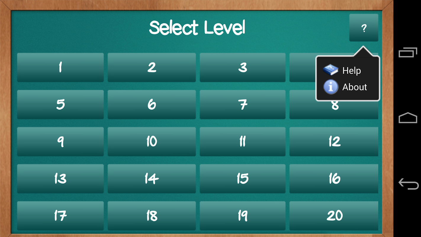 The difficulty of the levels is proportional to the number of selected level. It starts from the easiest level (level 1) to the hardest (level 20).