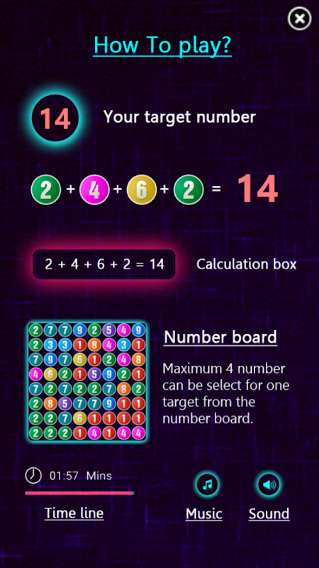 Just touch the one or more numbers from the board and make addition of these numbers are equal to target number. You can select maximum 4 number from the number board. If target achieves then selected number remove from board. Use must remove all the numbers from the board in define time interval to complete this board game.