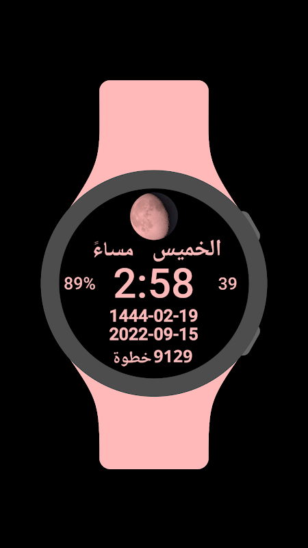 OS عربی گھڑی کا چہرہ ہجری تاریخ، گریگورین تاریخ اور اسٹیپس کاؤنٹر کے ساتھ پہنیں۔