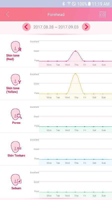 *전용 애플리케이션에서 제공하는 피부상태 측정 서비스로 피부결, 피부톤, 유분, 모공 상태를 수치와 그래프로 확인하세요.