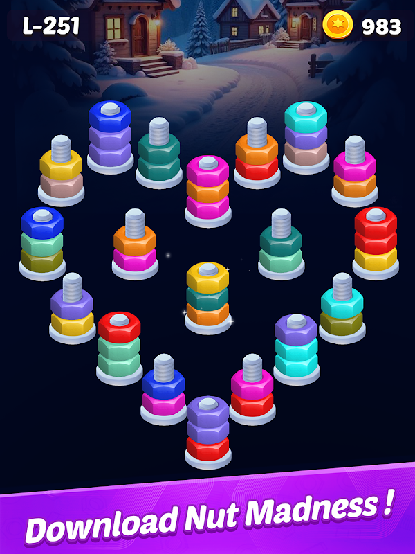 ہر سطح رنگین گری دار میوے کی پہیلی کے ٹکڑوں کی الجھی ہوئی گندگی سے بھری ہوئی ہے۔ آپ کا کام؟ ہر رنگ کو اس کے مماثل بولٹ پر چھانٹ کر گری دار میوے اور بولٹ کو جوڑیں اور اسٹیک کریں۔ آسان لگتا ہے؟ اسکرو چھانٹ شروع ہونے تک انتظار کریں!