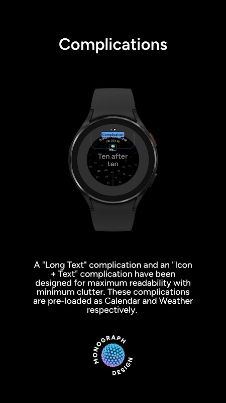 پیچیدگیاں: ایک "لمبا متن" پیچیدگی اور ایک "آئیکن + ٹیکسٹ" پیچیدگی کو کم سے کم بے ترتیبی کے ساتھ زیادہ سے زیادہ پڑھنے کے قابل بنایا گیا ہے۔ یہ پیچیدگیاں بالترتیب کیلنڈر اور موسم کے طور پر پہلے سے بھری ہوئی ہیں۔