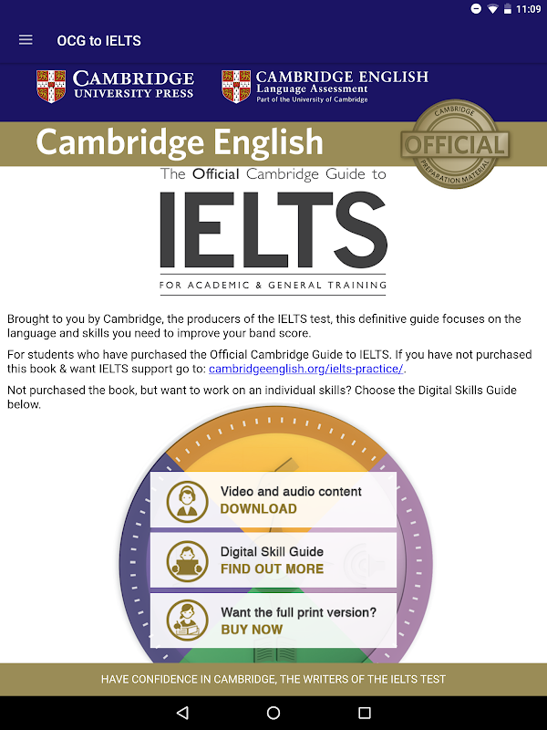 This app is for students who have purchased the full print Official Cambridge Guide to IELTS. If you have not purchased this book and are looking for IELTS support please visit www.cambridgeenglish.org/ielts-practice/.