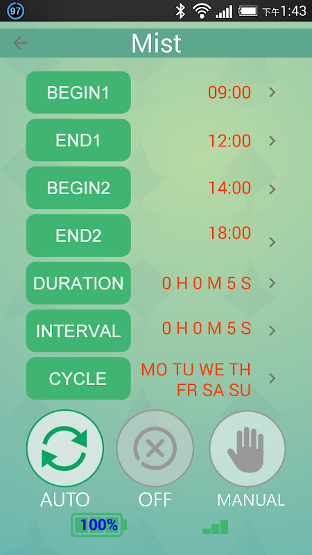 Bluetooth modules using firmware 4.0 or above are connectable with this application. It offers spray watering programs or mist watering programs. The spray watering program allows 2 specified start watering time per day, while the frequency can be set by days of the week, or how many days. The mist watering program allows 2 time period per day to run the watering cycles.