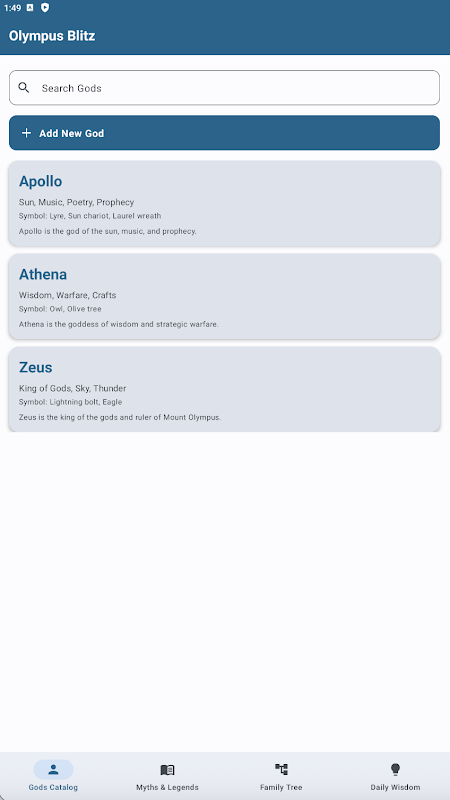 Explore the rich world of Greek mythology with this interactive mobile companion. Discover fascinating stories about gods, goddesses, and legendary heroes from ancient Greece. Browse through detailed profiles of divine beings, each with their domains, symbols, and mythological backgrounds. Read captivating myths and legends, bookmark your favorites, and learn timeless moral lessons. Explore complex family relationships between deities with detailed genealogical connections. Enjoy daily mythological facts, trivia, and wisdom to expand your knowledge. Track your learning progress with achievement badges and reading milestones. Add your own entries, notes, and discoveries to personalize your mythological journey. Experience smooth navigation and beautiful card-based design throughout the app. Perfect for mythology enthusiasts, students, and anyone curious about ancient Greek culture and stories.