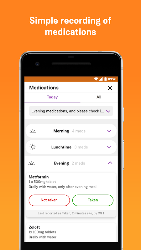 OnCare ایک کلائنٹ کی دوائیوں کی فہرست، ان کے شیڈول اور ہدایات اور یہ نشان زد کرنے کی صلاحیت کو آسان بناتا ہے کہ صرف چند ٹیپس اور تفصیل کے ساتھ وزٹ کے دوران کون سی دوائیاں دی گئیں۔