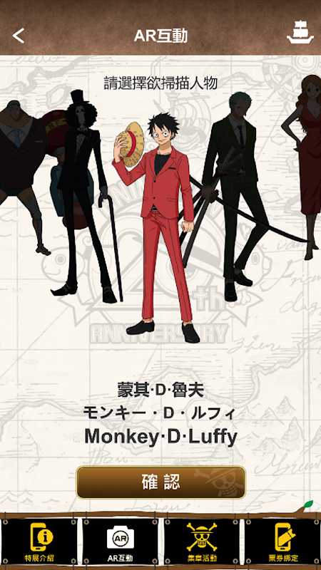 本 APP 將與夥伴一起前往「 ONE PIECE 動畫二十週年紀念特展 」冒險,並提供以下專屬服務,一起回顧動畫二十週年的冒險感動: