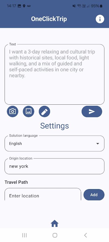 OneClickTrip - آپ کا سمارٹ AI سے چلنے والا ٹریول پلانر۔ بس اپنے خوابوں کے سفر کی وضاحت کریں یا انسپائریشن اپ لوڈ کریں، اور فوری طور پر ہر دن کے لیے نقل و حمل کے اختیارات، ہوٹل کے لنکس، بجٹ کے تخمینے، اور مقامی تجاویز کے ساتھ ایک ذاتی منصوبہ حاصل کریں۔