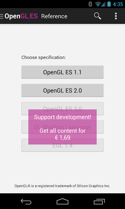 OpenGL ES 3.0, GL Shading Language and EGL 1.4 reference manuals can be unlocked with an in-app purchase, which supports the development of this app!