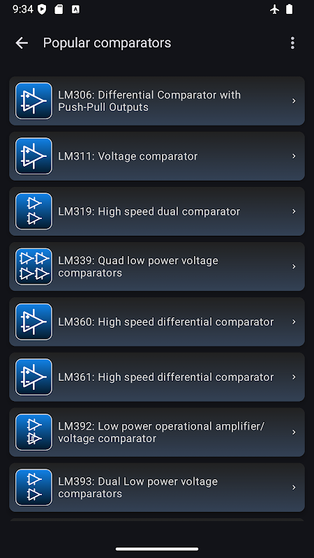 پروجیکٹ تیار کرتے وقت، پروٹو ٹائپس بناتے وقت، یا ایمپلیفائر کنفیگریشنز کا مطالعہ کرتے وقت اسے ایک عملی حوالہ کے طور پر استعمال کریں۔ ایپ میں مقبول آپریشنل ایمپلیفائر اور کمپیریٹر سیریز کا تکنیکی ڈیٹا بھی شامل ہے - جو اسے ڈیزائن اور انتخاب دونوں کے لیے ایک آسان رہنما بناتا ہے۔