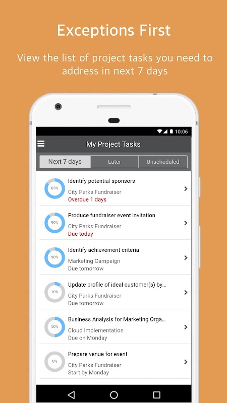 اس ایپ میں، آپ اضافی فلٹرز لگائے بغیر اپنے پروجیکٹ کے کاموں اور کرنے کے کاموں کو آسانی سے دیکھ سکتے ہیں۔ آپ اپنے کام سے متعلق تمام سرگرمیوں کو ایک جگہ پر رکھنے کے لیے فوری طور پر کرنے والے کام بنا سکتے ہیں اور انہیں مکمل کے بطور نشان زد کر سکتے ہیں۔ ٹیم کے اراکین کے ساتھ تعاون اوریکل سوشل نیٹ ورک (OSN) موبائل ایپلیکیشن کے ذریعے فراہم کیا جاتا ہے، جسے الگ سے ڈاؤن لوڈ کیا جاتا ہے۔