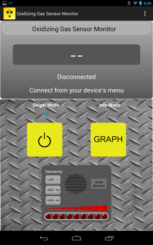 This app uses the oxidizing gas sensor on the Sensordrone to act as a gas sniffer of various oxidizing gases like nitrogen dioxide, chlorine, and ozone.