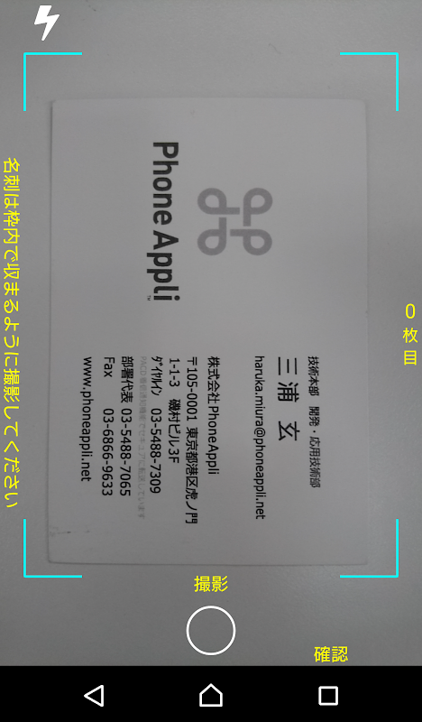 1.アプリ内からカメラを起動し、名刺を撮影 (最大20枚連続で撮影可能)