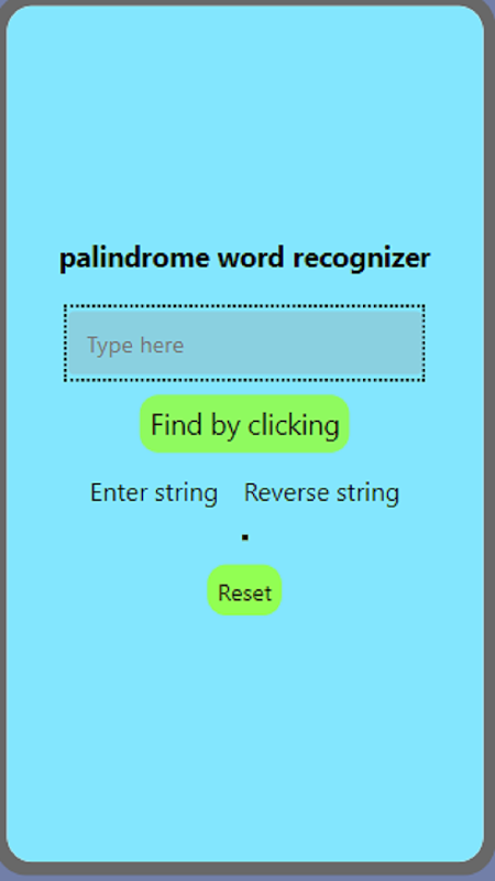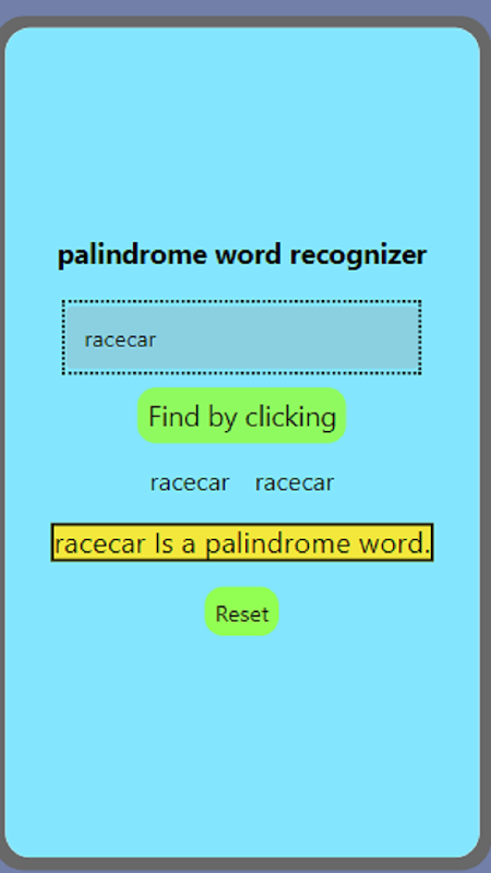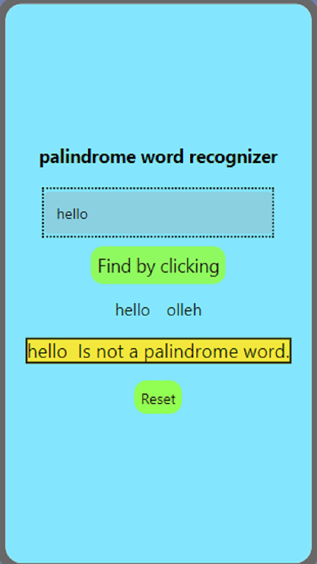 ایپلیکیشن چیک کرے گی کہ آیا یہ لفظ پیلینڈروم ہے یا نہیں۔ ٹھیک ہے یہ تکنیکی طور پر آپ کو بتاتا ہے کہ آیا لفظ ایک ہی الٹ اور معیاری شکلوں میں ہے۔