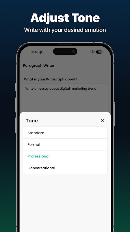 ہمارے AI پیراگراف جنریٹر کے ساتھ صرف سیکنڈوں میں کسی بھی موضوع پر حسب ضرورت پیراگراف تیار کریں۔ چاہے آپ کو بلاگ، مضمون یا رپورٹ کے لیے تخلیقی پیراگراف کی ضرورت ہو، ایپ اس بات کو یقینی بناتی ہے کہ آپ کا مواد اچھی طرح سے ساختہ، واضح اور دلکش ہے۔ اپنی ضروریات کے مطابق متنوع تحریری ٹونز (رسمی، آرام دہ، تعلیمی، وغیرہ) میں سے انتخاب کریں۔