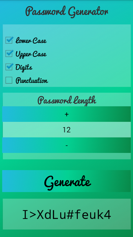 Password Generator is an app for generating secure passwords using cryptographic ally secure pseudo-random number generator. You are given options to choose which characters your password should contain or you can choose your set of a custom symbols. Generating passwords with Password Generator is fast and easy, just check options and hit a button.