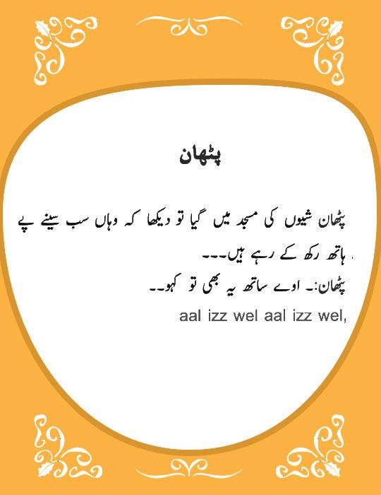 The application of Pathan Jokes is full of most funny jokes collected from various sources for your enjoyment. Please rate Pathan Jokes if you find it funny :) Pathan Jokes is one of the best applications that contain quality jokes in the Urdu language. New Jokes in this Pathan Jokes (Lateefay) application are added regularly.