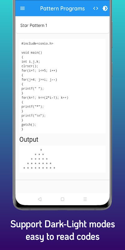 This app contains pattern programs and is to understand how we can code ASCII pattern programs in programming languages like C, C++, C#, Java, and Python.
