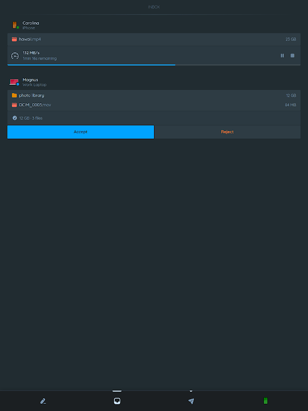 فائلوں کو کسی بھی موبائل یا ڈیسک ٹاپ ڈیوائسز کے درمیان جتنی تیزی سے آپ کا نیٹ ورک اجازت دیتا ہے محفوظ طریقے سے منتقل کریں۔ اصل معیار کی تصاویر اور ویڈیو، پی ڈی ایف اور اس کے درمیان ہر چیز۔