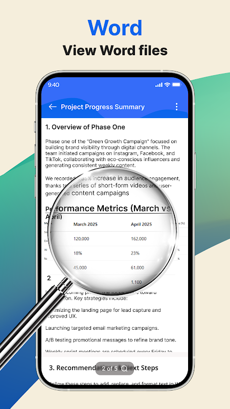 پی ڈی ایف ریڈر: ورڈ، ایکسل، پی پی ٹی کو فائل دیکھنے کو آسان اور آسان بنانے کے لیے ڈیزائن کیا گیا ہے۔ آپ ہماری پی ڈی ایف ریڈر ایپ میں اپنے دستاویزات کو پڑھ سکتے ہیں، ان کا نظم کر سکتے ہیں اور ان کا اشتراک کر سکتے ہیں۔