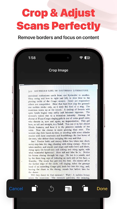 اپنے فون کے کیمرے کے ذریعے دستاویزات کیپچر کریں، کیونکہ ایپلیکیشن کناروں کا پتہ لگاتی ہے، سائے کو ہٹاتی ہے، اور آپ کے اسکین کو تیز کرتی ہے۔ ایک صفحہ یا بیچ: آپ ہمیشہ صاف، پیشہ ورانہ نتائج کے ساتھ ختم ہوں گے۔