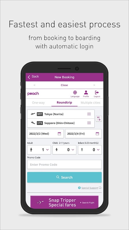 پہلی بار جب آپ ایپ استعمال کرتے ہیں تو اپنے پیچ اکاؤنٹ میں لاگ ان کریں، اور اس کے بعد آپ ہمیشہ لاگ ان رہیں گے۔ اس سے بکنگ کے وقت پریشانی کی معلومات داخل کرنے کی ضرورت ختم ہوجاتی ہے، اور آپ کی بکنگ کی معلومات خود بخود ایپ سے منسلک ہوجائے گی، تاکہ آپ اس کے بعد آسانی سے آگے بڑھ سکیں۔